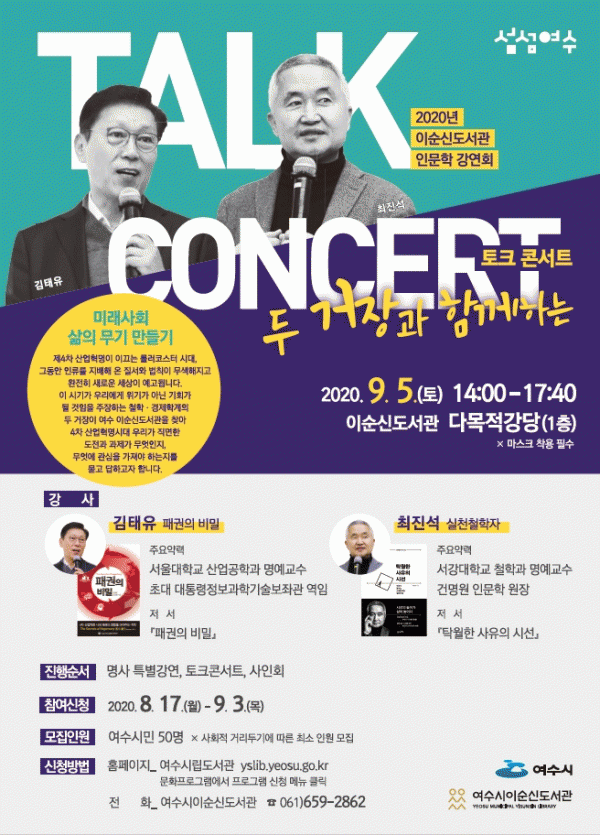 [¹Ìµð¾îÀü³² ÀüÇü¼º ±âÀÚ] ¿©¼ö½ÃÀ̼ø½Åµµ¼°ü¿¡¼ 9¿ù µ¶¼ÀÇ ´ÞÀ» ¸ÂÀÌÇØ ÅäÅ©ÄܼƮ Çü½ÄÀÇ Àι®ÇÐ °¿¬È¸¸¦ °³ÃÖÇÑ´Ù. ÃÊû ÀÛ°¡´Â¡®ÆÐ±ÇÀÇ ºñ¹Ð¡¯ÀúÀÚÀÎ ±èÅÂÀ¯ ±³¼ö¿Í ¡®Å¹¿ùÇÑ »çÀ¯ÀÇ ½Ã¼±¡¯ÀúÀÚÀÎ ÃÖÁø¼® ±³¼ö·Î ¡®¹Ì·¡ »çȸ »î¡¦