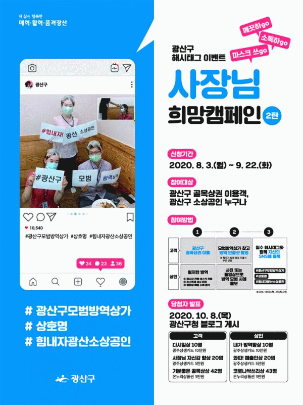 [¹Ìµð¾îÀü³² ±èÁ¤¿ì ±âÀÚ] ±¤»ê±¸°¡ Äڷγª19 Áö¿ª»çȸ Àç È®»êÀ¸·Î À§ÃàµÈ °ñ¸ñ»ó±ÇÀÇ È°¼ºÈ¿Í ½Ã¹ÎÀÇ °ñ¸ñ»óÁ¡ ¾È½É ÀÌ¿ëÀ» À§ÇØ ¡®»çÀå´Ô Èñ¸Á Ä·ÆäÀΡ¯ 2źÀ¸·Î ¡®¸ð¹ü ¹æ¿ª »ó°¡ ã±â¡¯¸¦ ´ÙÀ½´Þ 22ÀϱîÁö ½Ç½ÃÇÑ´Ù. À̹ø Ä·ÆäÀΡ¦