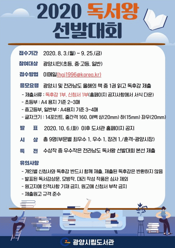 [¹Ìµð¾îÀü³² ÀüÇü¼º ±âÀÚ] ±¤¾ç½Ã´Â ½Ã¹ÎµéÀ» ´ë»óÀ¸·Î ¿ÃÇØÀÇ Ã¥ Àб⠹®È¸¦ È®»êÇÏ°í ±Û¾²±â ¿ª·®À» ³ôÀ̱â À§ÇØ ¡®µ¶¼¿Õ ¼±¹ß´ëȸ¡¯¸¦ °³ÃÖÇÑ´Ù°í 30ÀÏ ¹àÇû´Ù. µ¶¼¿Õ ¼±¹ß´ëȸ´Â µ¶Èݨ °ø¸ðÀüÀ¸·Î ÃʵîºÎ, Áß¡¤°íµîºÎ, ÀϹݺΠ¡¦