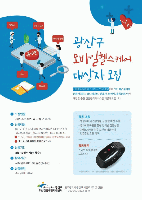 [¹Ìµð¾îÀü³² ±èÁ¤¿ì ±âÀÚ] ±¤ÁÖ±¤¿ª½Ã ±¤»ê±¸ ¿ì»ê°Ç°»ýȰÁö¿ø¼¾ÅÍ´Â Äڷγª19·Î °Ç°°ü¸®°¡ ¾î·Á¿î Áö¿ªÁÖ¹ÎÀ» À§ÇØ ºñ´ë¸é °Ç°°ü¸® »ç¾÷ÀÎ ¡®¸ð¹ÙÀÏ ÇコÄɾ Âü¿©ÀÚ¸¦ Ãß°¡ ¸ðÁýÇÑ´Ù. ¸ð¹ÙÀÏ ÇコÄɾî´Â º¸°Ç¼Ò ¹æ¹® °ËÁøÀ¸·Î °Ç¡¦