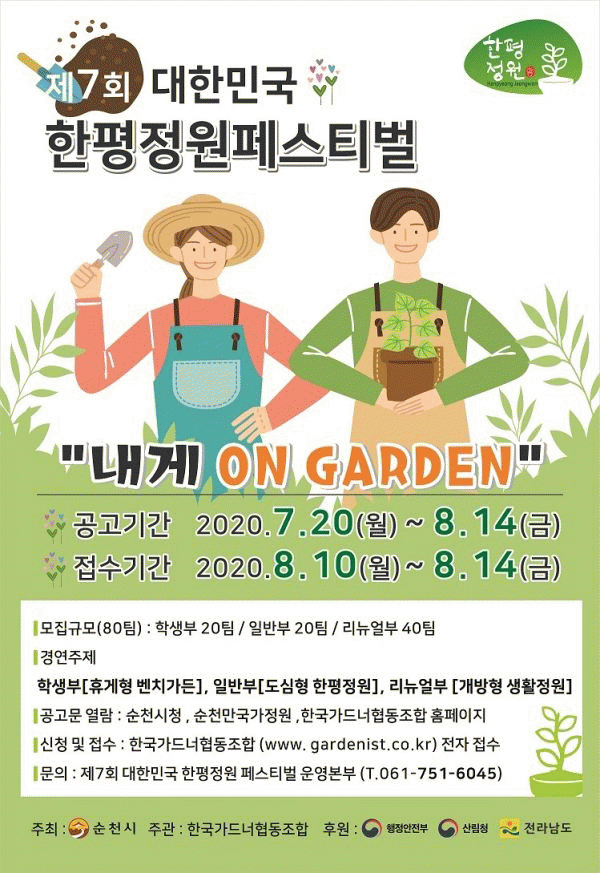 [¹Ìµð¾îÀü³² Á¦°¥´ëÁ¾ ±âÀÚ] ¼øÃµ½Ã°¡ Àç´ÉÀÖ´Â Á¤¿øµðÀÚÀÌ³Ê ¹ß±¼°ú ´ëÇѹα¹ Á¤¿ø¹®È È®»êÀ» ¸ñÀûÀ¸·Î ÇÏ´Â ¡®Á¦7ȸ ´ëÇѹα¹ ÇÑÆòÁ¤¿ø Æä½ºÆ¼¹ú¡¯ Âü°¡ÀÚ¸¦ ¸ðÁýÇÑ´Ù. ¡®³»°Ô ON GARDEN¡¯À̶ó´Â ÁÖÁ¦·Î ÁøÇàµÇ´Â À̹ø ÇÑÆòÁ¤¿ø Æä½º¡¦