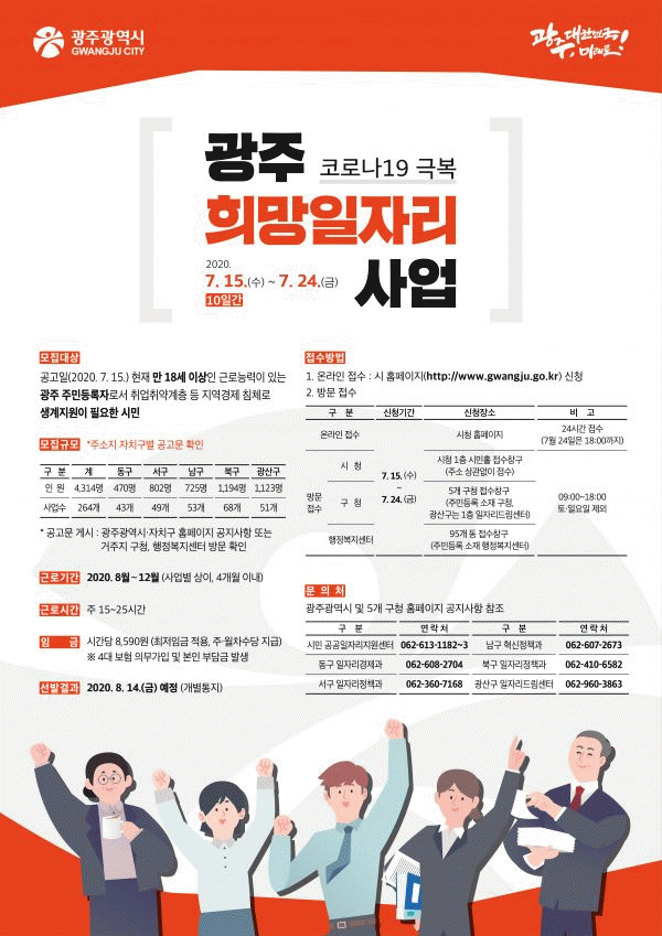 [¹Ìµð¾îÀü³² ±èÁ¤¿ì ±âÀÚ]±¤ÁÖ ¼±¸°¡ Äڷγª19 ±Øº¹ Èñ¸ÁÀÏÀÚ¸®»ç¾÷ Âü¿©ÀÚ¸¦ ¸ðÁýÇÑ´Ù. Èñ¸ÁÀÏÀÚ¸®»ç¾÷Àº ±¤Áֽà °ø°øÀÏÀÚ¸®»ç¾÷ 2´Ü°è ÀÚÄ¡±¸ ÀÚÀ²Çü»ç¾÷°ú Áö³ 6¿ù 1ÀÏ Á¦6Â÷ ºñ»ó°æÁ¦È¸ÀÇ¿¡¼ Á¤ºÎ°¡ ¹ßÇ¥ÇÑ ¡®±ä±ÞÀÏÀÚ¸®Á¦°ø µî¡¦
