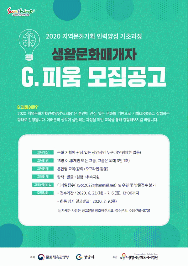 [¹Ìµð¾îÀü³² Á¦°¥´ëÁ¾ ±âÀÚ] ±¤¾ç½Ã¹®Èµµ½Ã»ç¾÷´ÜÀº 7¿ù 6ÀϱîÁö ¡®2020 Áö¿ª¹®È±âȹ Àη¾缺 ±âÃʰúÁ¤¡¯ »ýȰ¹®È¸Å°³ÀÚ ¡®G.ÇÇ¿ò¡¯ Âü°¡ÀÚ¸¦ ¸ðÁýÇÑ´Ù°í 29ÀÏ ¹àÇû´Ù. Âü°¡ÀÚ´Â 15¸í À̳»·Î ¸ðÁýÇϸç Áö¿ª¹®È ±âȹ¿¡ °ü½É ÀÖ´Â ±¤¡¦