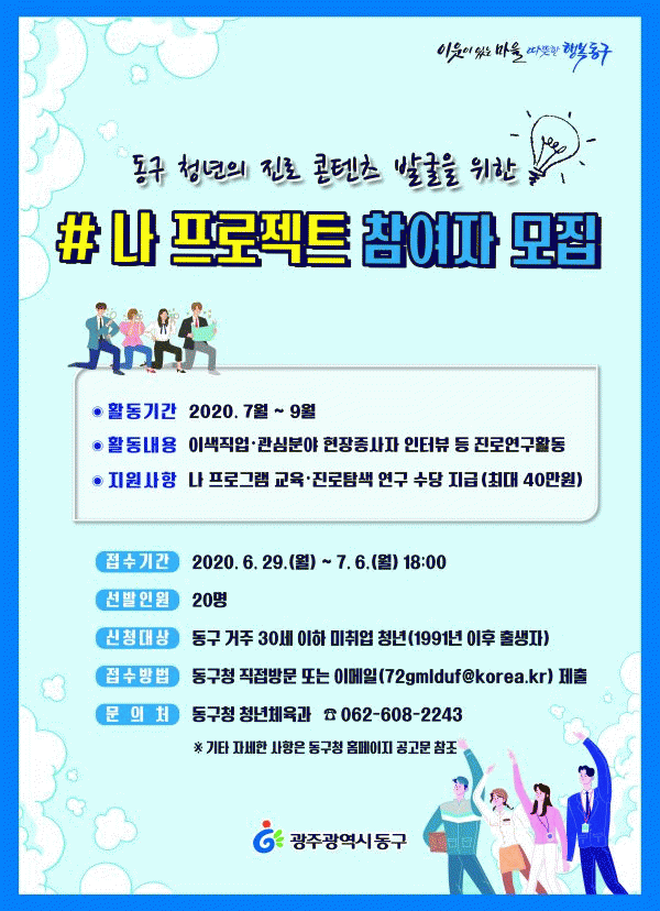 [¹Ìµð¾îÀü³² ±èÁ¤¿ì ±âÀÚ]±¤ÁÖ µ¿±¸°¡ ¹ÌÃë¾÷ û³âµéÀÇ °æÇèÈ®ÀåÀ» À§ÇÑ ¡®Ã»³â Áø·ÎÄÜÅÙÃ÷ ¹ß±¼ ÇÁ·ÎÁ§Æ®¡¯ Âü¿©ÀÚ¸¦ ´ÙÀ½´Þ 6ÀϱîÁö ¸ðÁýÇÑ´Ù°í ¹àÇû´Ù. À̹ø ÇÁ·ÎÁ§Æ®´Â û³âµéÀÌ Á÷Á¢ Á¦¾ÈÇØ ¿¹»ê¿¡ ¹Ý¿µµÈ ÁÖ¹ÎÂü¿©¿¹»ê û³âÁ¤Ã¥ºÐ¡¦