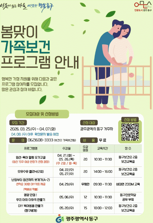 [¹Ìµð¾îÀü³² Á¦°¥´ëÁ¾ ±âÀÚ] ±¤ÁÖ µ¿±¸´Â Àӽš¤Ãâ»ê °¡Á¤ÀÇ °Ç° ÁõÁø°ú °¡Á· Ä£ÈÀû ȯ°æ Á¶¼ºÀ» À§ÇØ ¡®º½¸ÂÀÌ °¡Á·º¸°Ç ÇÁ·Î±×·¥¡¯ Âü°¡ÀÚ¸¦ ¸ðÁýÇÑ´Ù°í ¹àÇû´Ù. À̹ø ÇÁ·Î±×·¥Àº ÀÓ»êºÎ¿Í ¿¹ºñ ºÎ¸ð, ¿µÀ¯¾Æ ¾çÀ°°¡Á¤, ³ÀÓ ºÎºÎ¸¦¡¦