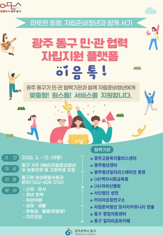 [¹Ìµð¾îÀü³² Á¦°¥´ëÁ¾ ±âÀÚ] ±¤ÁÖ µ¿±¸´Â º¸È£ Á¾·á 5³â À̳» ÀÚ¸³ Áغñ û³âÀ» ´ë»óÀ¸·Î ¹Î¡¤°ü Çù·Â ÀÚ¸³Áö¿ø Ç÷§Æû ¡®ÀÌÀ½Åå!¡¯ »ç¾÷À» Áö³ÇØ¿¡ À̾î 2026³â¿¡µµ Áö¼Ó ÃßÁøÇÑ´Ù°í ¹àÇû´Ù. ¡®ÀÌÀ½Åå!¡¯ »ç¾÷Àº ÀÚ¸³Áغñû³âµéÀÌ ÀÚ¸³¡¦