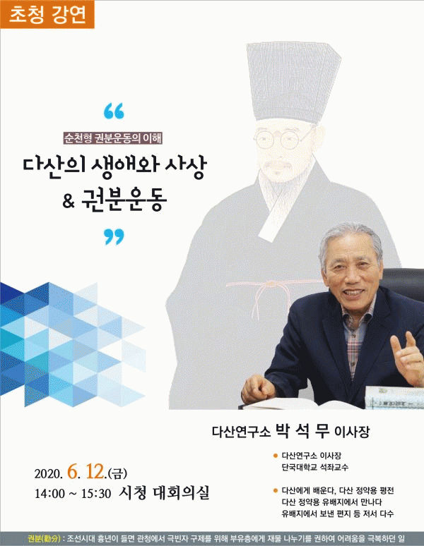 [¹Ìµð¾îÀü³² Á¦°¥´ëÁ¾ ±âÀÚ] ¼øÃµ½Ã´Â ¿À´Â 6¿ù 12ÀÏ ´Ù»ê¿¬±¸¼Ò ¹Ú¼®¹« ÀÌ»çÀåÀ» ÃÊÃ»ÇØ ´Ù»ê Á¤¾à¿ëÀÇ »ý¾Ö¿Í »ç»ó ±×¸®°í¡®¼øÃµÇü ±ÇºÐ¡¯ÀÇ ÀÌÇØ¸¦ µ½´Â °¿¬À» ½Ãû ´ëȸÀǽǿ¡¼ °³ÃÖÇÑ´Ù°í ¹àÇû´Ù. À̹ø °¿¬Àº ´Ù»êÀÇ Çй®°ú »ç»ó¡¦