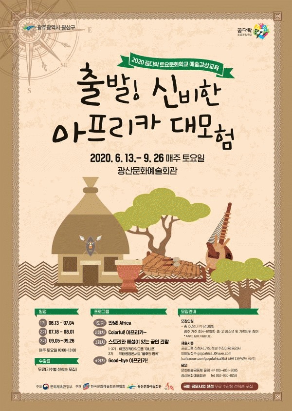 [¹Ìµð¾îÀü³² ±èÁ¤¿ì ±âÀÚ] ±¤»ê±¸°¡, ¾ÆÇÁ¸®Ä« ¸®µëÀ¸·Î ¿¹¼úÀ» ¹è¿ì°í °¨»óÇÏ´Â, ¡®Ãâ¹ß ½ÅºñÇÑ ¾ÆÇÁ¸®Ä« ´ë¸ðÇ衯 ÇÁ·Î±×·¥¿¡ Âü¿©ÇÒ 1±â ¼ö°»ý 50¸íÀ» ´ÙÀ½´Þ 10ÀϱîÁö ¼±Âø¼ø ¸ðÁýÇÑ´Ù. ¹®È¿¹¼ú°øµ¿Ã¼ ¡®¿ï¸²¡¯ÀÌ ±¤»ê¹®¿¹È¸°ü°ú¡¦