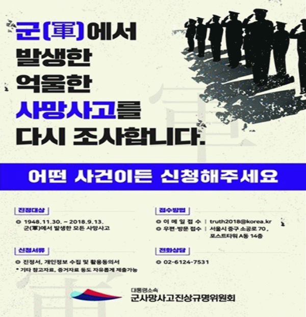 [¹Ìµð¾îÀü³² Á¦°¥´ëÁ¾ ±âÀÚ] ´ã¾ç±ºÀÌ ±º º¹¹« Áß ¹ß»ýÇÑ Àǹ® »ç¸Á»ç°íÀÇ Áø»ó ±Ô¸íÀ» À§ÇØ Ãâ¹üÇÑ ±º»ç¸Á»ç°íÁø»ó±Ô¸íÀ§¿øÈ¸ÀÇ È«º¸ Áö¿ø¿¡ ³ª¼¹´Ù. Áö³ 2018³â 9¿ù Ưº°¹ý¿¡ µû¶ó ´ëÅë·É ¼Ò¼ÓÀ¸·Î ¹ßÁ·ÇÑ À§¿øÈ¸´Â ±º´ë¿¡¼ ÀϾ¦
