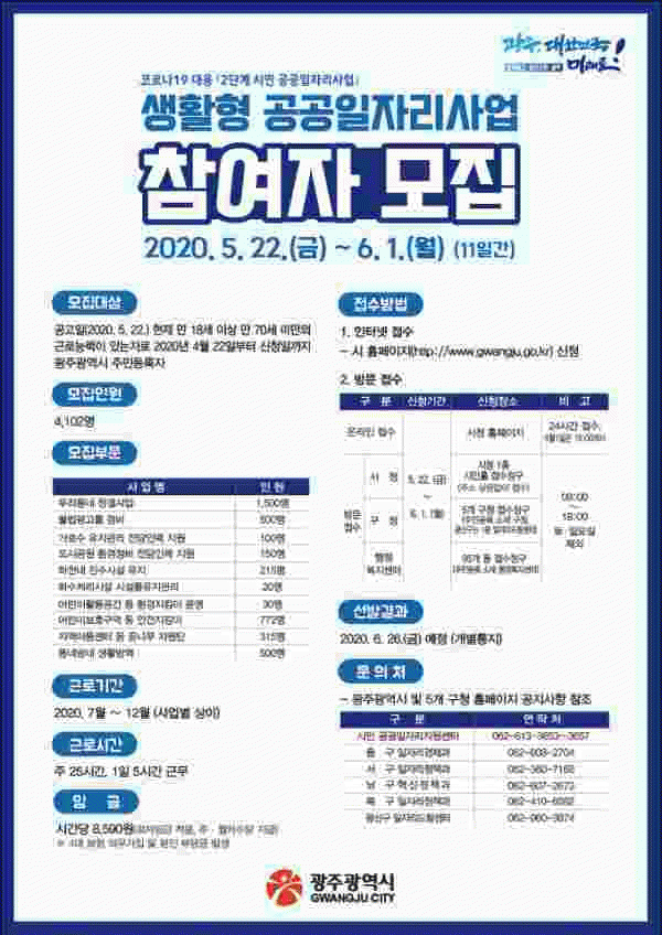 [¹Ìµð¾îÀü³² Á¦°¥´ëÁ¾ ±âÀÚ] ±¤ÁÖ±¤¿ª½Ã°¡ Äڷγª19·Î ¾î·Á¿òÀ» °Þ°í ÀÖ´Â ½Ã¹ÎµéÀÇ »ýȰ¾ÈÁ¤À» µµ¸ðÇϰí Áö¿ª°æÁ¦¸¦ »ì¸®±â À§ÇØ 1´Ü°è »ýȰ¹æ¿ªºÐ¾ß 971¸í ä¿ë¿¡ ÀÌ¾î ½Ã¹Î °ø°øÀÏÀÚ¸® 2´Ü°è »ç¾÷À» º»°Ý ÃßÁøÇÑ´Ù. 2´Ü°è´Â ¹Î»ý ¾È¡¦