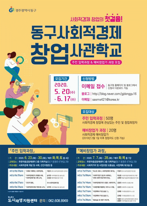 [¹Ìµð¾îÀü³² ±èÁ¤¿ì ±âÀÚ] ±¤ÁÖ µ¿±¸°¡ ¸¶À»±â¹ÝÀÇ Áö¼Ó°¡´ÉÇÑ »çȸÀû°æÁ¦ ¸ðµ¨ ¹ß±¼À» À§ÇÑ ¡®»çȸÀû°æÁ¦Ã¢¾÷»ç°üÇб³¡¯ ¼ö°»ýÀ» ´ÙÀ½´Þ 17ÀϱîÁö ¸ðÁýÇÑ´Ù°í ¹àÇû´Ù. ¿À´Â 6¿ù 23ÀϺÎÅÍ 28ÀϱîÁö 2ÁÖ°£ Ǫ¸¥¸¶À»°øµ¿Ã¼¼¾ÅÍ¿¡¼ ÁøÇàµÇ¡¦