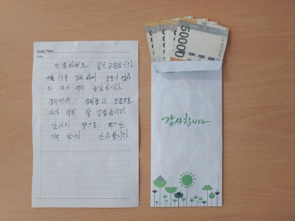 [¹Ìµð¾îÀü³² ±èÁ¤¿ì ±âÀÚ] Äڷγª19 ÀÚ°¡ °Ý¸®¸¦ ¸¶Ä£ À͸íÀÇ Áß±¹±³Æ÷°¡ 15ÀÏ ±¤»ê±¸Ã»À» ¹æ¹®ÇØ 1Ãþ ¾È³»Ä«¿îÅÍ Á÷¿ø¿¡°Ô ¼Õ ÆíÁö¿Í Çö±Ý 50¸¸¿øÀ» ¸Ã±â°í °¬´Ù. ÀÌ Áß±¹±³Æ÷°¡ ÀüÇÑ ¼Õ ÆíÁö¿¡´Â ¡°Áß±¹±³Æ÷ÀÌ´Ù. 4¿ù17ÀÏ ÀÔ±¹ÇØ ÄÚ¡¦