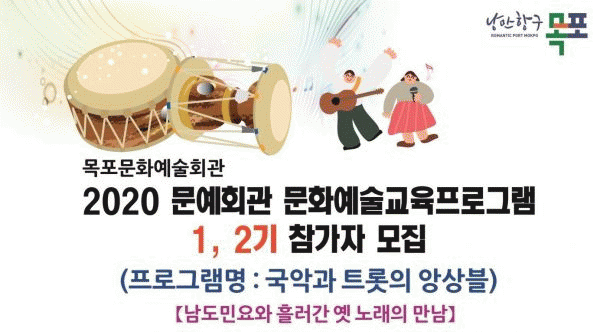 [¹Ìµð¾îÀü³² Á¦°¥´ëÁ¾ ±âÀÚ] ¸ñÆ÷¹®È¿¹¼úȸ°üÀÌ Áö¿ª¹ÎÀ» À§ÇÑ 2020³â ¹®¿¹È¸°ü ¹®È¿¹¼ú±³À°ÇÁ·Î±×·¥ ¡®±¹¾Ç°ú Æ®·ÔÀÇ ¾Ó»óºí¡¯ Âü°¡ÀÚ¸¦ ¸ðÁýÇÑ´Ù. ³²µµ¹Î¿ä¿¡¼ºÎÅÍ Èê·¯°£ ¿¾ ³ë·¡±îÁö ´Ù¾çÇÑ À帣ÀÇ À½¾ÇÀ» ¹è¿ï ¼ö ÀÖ´Â ÇÁ·Î±×·¥¡¦