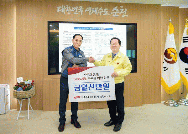 [¹Ìµð¾îÀü³² Á¦°¥´ëÁ¾ ±âÀÚ] Àü±¹°ø¹«¿ø³ëµ¿Á¶ÇÕ ¼øÃµ½ÃÁöºÎ´Â Áö³ 7ÀÏ Äڷγª19·Î ¾î·Á¿òÀ» °Þ´Â ½Ã¹Îµé¿¡°Ô ÈûÀ» ÁÖ´Â ¡®¼øÃµÇü ±ÇºÐ¿îµ¿¡¯¿¡ Á¶ÇÕ¿øµéÀÇ ¸¶À½À» ´ãÀº ¡®ÀÀ¿øÀÇ ¼º±Ý 1õ¸¸¿ø¡¯À» Àü³²»çȸº¹Áö°øµ¿¸ð±Ýȸ¿¡ ÁöÁ¤ ±âŹÇß¡¦