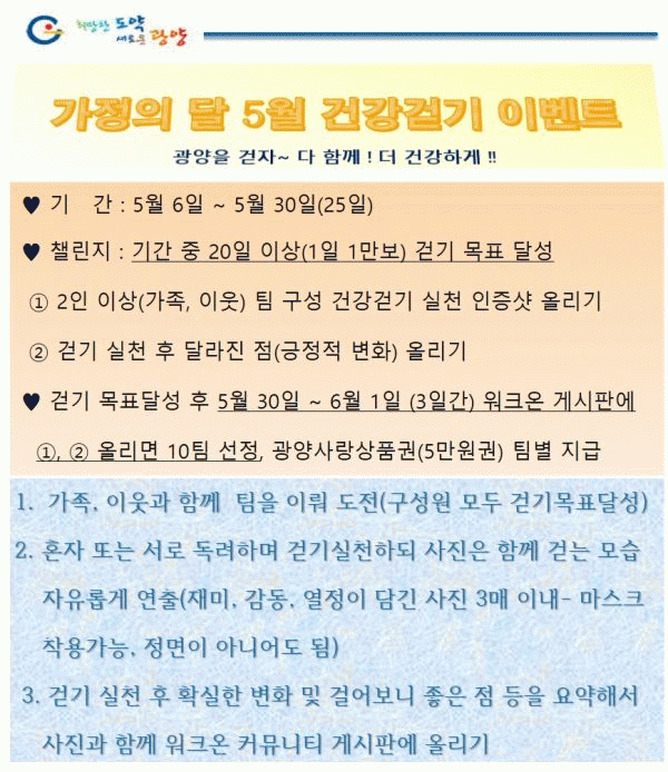 [¹Ìµð¾îÀü³² Á¦°¥´ëÁ¾ ±âÀÚ]±¤¾ç½Ã°¡ °¡Á¤ÀÇ ´ÞÀ» ¸Â¾Æ ¡°ÇÔ²²ÇÏ¸é ±â»Ý µÎ ¹è¡±¶ó´Â ½½·Î°ÇÀ¸·Î °¡Á·, ÀÌ¿ô°ú ÇÔ²² ¼·Î ÀÀ¿øÇϸç Áñ°Ì°Ô °È±â¸¦ ½ÇõÇÒ ¼ö ÀÖ´Â °Ç°ÇÁ·ÎÁ§Æ® ¡®¸ð¹ÙÀÏ °È±â¾Û ¿öÅ©¿Â À̺¥Æ®¡¯¸¦ ½Ç½ÃÇÑ´Ù°í 6ÀÏ ¹àÇû´Ù¡¦