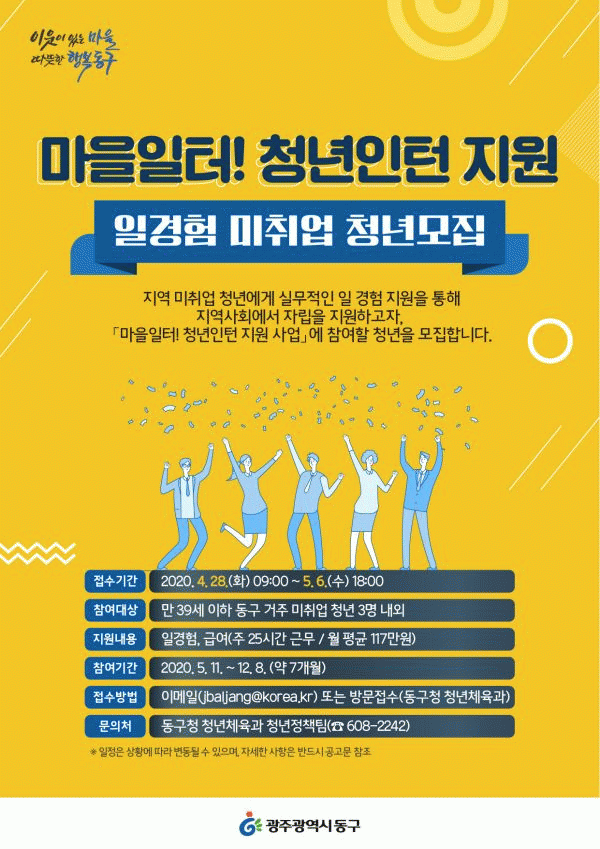 [¹Ìµð¾îÀü³² ±èÁ¤¿ì ±âÀÚ] ±¤ÁÖ µ¿±¸°¡ ¡®2020³â Áö¿ªÁÖµµÇü û³âÀÏÀÚ¸®»ç¾÷¡¯À» ÅëÇØ ²Þ°ú µµÀüÀ» À̾ Áö¿ªÃ»³âÀ» Ãß°¡ ¸ðÁýÇÑ´Ù°í ¹àÇû´Ù. Ãß°¡¸ðÁý ºÐ¾ß´Â ¹ÌÃë¾÷ Áö¿ªÃ»³âµéÀ» ´ë»óÀ¸·Î µ¿±¸ ¼ÒÀç ´Ù¾çÇÑ ÀÏÅÍ¿¡¼ ÀÏ °æÇèÀ» Áö¿ø¡¦