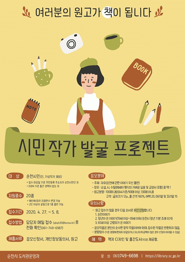 [¹Ìµð¾îÀü³² Á¦°¥´ëÁ¾ ±âÀÚ] ¼øÃµ½Ã´Â ¿ø°í¸¦ ½á ³õ°í °³ÀÎ »çÁ¤À¸·Î Ã¥À» ³»Áö ¸øÇϰí ÀÖ´Â ½Ã¹ÎµéÀÇ ¿ø°í¸¦ ¸ð¾Æ Ã¥À¸·Î ÃâÆÇÇÏ´Â ¡®½Ã¹Î ÀÛ°¡ ¹ß±¼ ÇÁ·ÎÁ§Æ®¡¯¸¦ 27ÀϺÎÅÍ ¿À´Â 5¿ù 8ÀϱîÁö ¿î¿µÇÑ´Ù°í ¹àÇû´Ù. Áö³ÇØ¿¡ ÀÌ¾î ¿ÃÇØ ¡¦