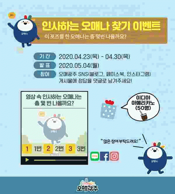 [¹Ìµð¾îÀü³² Á¦°¥´ëÁ¾ ±âÀÚ] ±¤ÁÖ±¤¿ª½Ã´Â Äڷγª19·Î ħüµÈ Áö¿ª °ü±¤¿¡ Ȱ·ÂÀ» ºÒ¾î³Ö±â À§ÇØ 23ÀϺÎÅÍ ¿À´Â 30ÀϱîÁö ¿À¸Å±¤ÁÖ ¹®È°ü±¤ ij¸¯ÅÍ ¡®¿À¸Å³ª ã±â¡¯ ¿Â¶óÀÎ À̺¥Æ®¸¦ ½Ç½ÃÇÑ´Ù. ¡®¿À¸Å³ª¡¯ ij¸¯ÅÍ´Â Áö³ 2¿ù ¡®¿À¸Å±¤¡¦