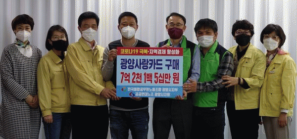 [¹Ìµð¾îÀü³² Á¦°¥´ëÁ¾ ±âÀÚ]Àü±¹ÅëÇÕ°ø¹«¿ø³ëµ¿Á¶ÇÕ ±¤¾ç½ÃÁöºÎ¿Í °ø°ø¿¬´ë³ëÁ¶ ±¤¾ç½ÃÁöȸ´Â 7¾ï2õ1¹é5½Ê¸¸¿ø »ó´çÀÇ ±¤¾ç»ç¶û»óǰ±ÇÄ«µå¸¦ Á¶ÇÕ¿øµéÀÌ ±¸¸ÅÇØ Äڷγª19 Á¶±â ±Øº¹°ú ħüµÈ Áö¿ª °æÁ¦ Ȱ¼ºÈ¿¡ ÈûÀ» º¸ÅÄ´Ù°í 22ÀÏ ¹àÇû¡¦