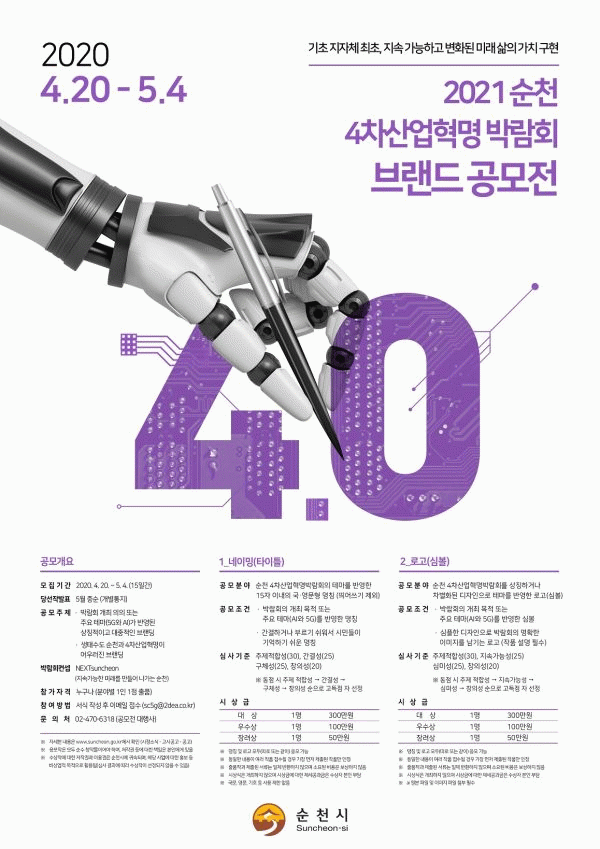 [¹Ìµð¾îÀü³² Á¦°¥´ëÁ¾ ±âÀÚ]¼øÃµ½Ã´Â 2021³â¿¡ °³ÃÖ °èȹÀÎ ¡®4Â÷»ê¾÷Çõ¸í¹Ú¶÷ȸ¡¯ÀÇ Å׸¶¿Í ÄܼÁÆ®¸¦ ¹Ý¿µÇÒ ¼ö ÀÖ´Â ºê·£µå¸¦ Àü ±¹¹Î ´ë»óÀ¸·Î 20ÀϺÎÅÍ ¿À´Â 5¿ù 4ÀϱîÁö °ø¸ðÇÑ´Ù°í ¹àÇû´Ù. ¡®2021 ¼øÃµ 4Â÷»ê¾÷Çõ¸í¹Ú¶÷ȸ¡¯´Â ¼øÃµ¡¦