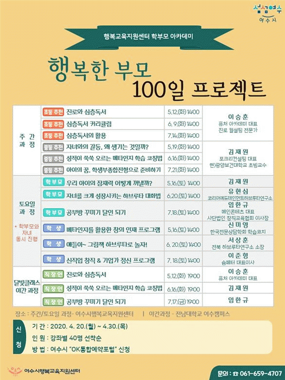 [¹Ìµð¾îÀü³² Á¦°¥´ëÁ¾ ±âÀÚ]¿©¼ö½Ã´Â ¿À´Â 20ÀϺÎÅÍ 30ÀϱîÁö ¡®ÇູÇÑ ºÎ¸ð, 100ÀÏ ÇÁ·ÎÁ§Æ®¡¯¸¦ ÁÖÁ¦·Î 2020³âµµ ÇÐºÎ¸ð ¾ÆÄ«µ¥¹Ì ¼ö°»ýÀ» ¸ðÁýÇÑ´Ù. ÃʵîÇб³, ÁßÇб³ Àڳฦ µÐ Çкθ𸦠´ë»óÀ¸·Î »ý¾ÖÁֱ⺰ ¸ÂÃãÇü ¾ÆÄ«µ¥¹Ì°¡ 5¿ù¡¦