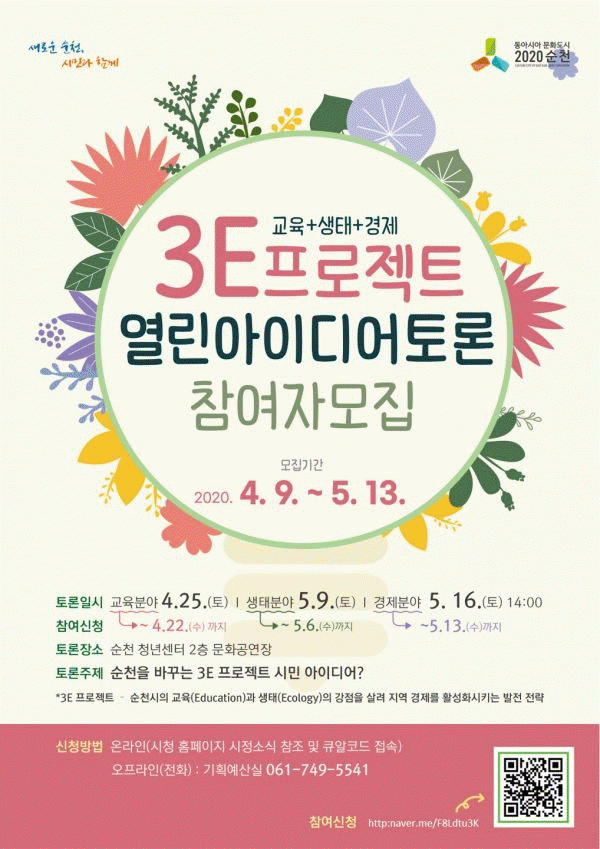[¹Ìµð¾îÀü³² Á¦°¥´ëÁ¾ ±âÀÚ] ¼øÃµ½Ã°¡ »ýŰæÁ¦µµ½Ã·ÎÀÇ »õ·Î¿î µµ¾àÀ» À§ÇØ ¿ªÁ¡ÀûÀ¸·Î ÃßÁøÇϰí ÀÖ´Â ¡®3E ÇÁ·ÎÁ§Æ® ¿¸° ¾ÆÀ̵ð¾î Åä·Ð¡¯¿¡ Âü°¡ÇÒ ½Ã¹ÎÀ» ¸ðÁýÇÑ´Ù°í ¹àÇû´Ù. 3E ÇÁ·ÎÁ§Æ®´Â ¿ì¼öÇÑ ±³À° ¿©°Ç°ú »ýÅÂȯ°æÀÇ °Á¡À» ¡¦