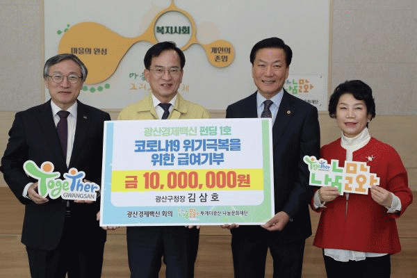 [¹Ìµð¾îÀü³² ±èÁ¤¿ì ±âÀÚ] 9ÀÏ ±è»ïÈ£ ±¤»ê±¸Ã»ÀåÀÌ, Åõ°Ô´õ±¤»ê³ª´®¹®ÈÀç´Ü¿¡¼ Äڷγª19 »çÅ·Π¾î·Á¿òÀ» °Þ°í ÀÖ´Â Áß¼Ò±â¾÷°ú ¼Ò»ó°øÀÎÀ» µ½´Â ¡®±¤»ê°æÁ¦¹é½Å ÆÝµù¡¯¿¡ 1,000¸¸¿øÀ» ±âŹÇϱâ·Î ¾à¼ÓÇß´Ù. À̳¯ ±è ûÀåÀÇ ³ª´®Àº,¡¦