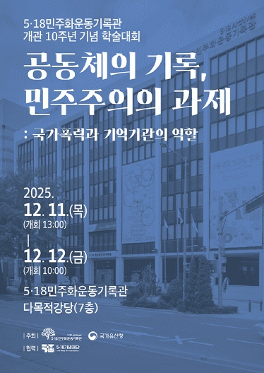 [¹Ìµð¾îÀü³² Á¦°¥´ëÁ¾ ±âÀÚ]±¤ÁÖ±¤¿ª½Ã 5¡¤18¹ÎÁÖȿ±â·Ï°üÀº ±¹°¡À¯»êû°ú ÇÔ²² ¿À´Â 11~12ÀÏ ÀÌÆ²°£ ±â·Ï°ü¿¡¼ ¡®°øµ¿Ã¼ÀÇ ±â·Ï, ¹ÎÁÖÁÖÀÇÀÇ °úÁ¦ : ±¹°¡Æø·Â°ú ±â¾ï±â°üÀÇ ¿ªÇÒ¡¯À» ÁÖÁ¦·Î °³°ü 10Áֳ⠱â³ä Çмú´ëȸ¸¦ °³ÃÖÇÑ´Ù.¡¦