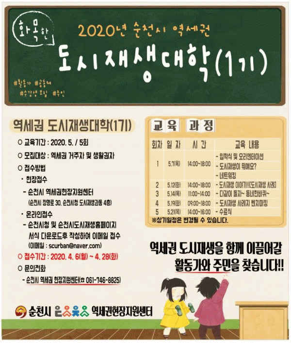 [¹Ìµð¾îÀü³² Á¦°¥´ëÁ¾ ±âÀÚ] ¼øÃµ½Ã´Â 3´Ü°è µµ½ÃÀç»ý ´ºµô»ç¾÷Áö±¸ÀÎ ¿ª¼¼±Ç ÁÖ¹ÎÀ» ´ë»óÀ¸·Î ¡®È¸ñÇÑ µµ½ÃÀç»ý´ëÇС¯À» ¿î¿µÇÑ´Ù°í ¹àÇû´Ù. µµ½ÃÀç»ý´ëÇÐÀº ´ÙÀ½´Þ 5¿ù 7ÀϺÎÅÍ ¸ÅÁÖ È¿äÀϰú ¸ñ¿äÀÏ ¿ÀÈÄ 2½ÃºÎÅÍ 6½Ã±îÁö ÃÑ 5ȸÂ÷ ¡¦