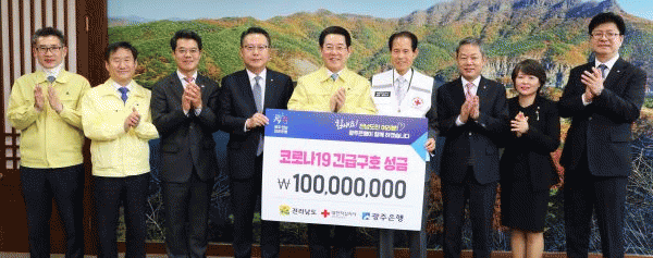 [¹Ìµð¾îÀü³² Á¦°¥´ëÁ¾ ±âÀÚ] Àü¶ó³²µµ´Â 19ÀÏ ±¤ÁÖÀºÇàÀ¸·ÎºÎÅÍ ¡®Äڷγª19¡¯ ±Øº¹À» À§ÇÑ ¼º±Ý 1¾ï¿øÀ» ±âŹ¹Þ¾Ò´Ù°í ¹àÇû´Ù. À̳¯ Àü³²µµÃ»¿¡¼ °¡Áø Àü´Þ½Ä¿¡´Â ±è¿µ·Ï Àü¶ó³²µµÁö»ç¿Í ¼ÛÁ¾¿í ±¤ÁÖÀºÇàÀå, ¹ÚÈï¼® ´ëÇÑÀû½ÊÀÚ»ç ±¤ÁÖÀü¡¦