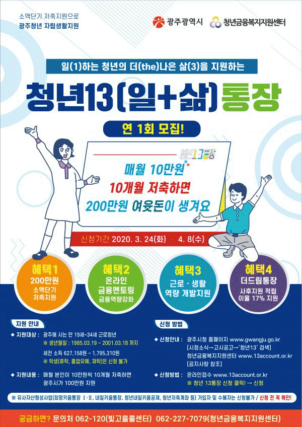 [¹Ìµð¾îÀü³² Á¦°¥´ëÁ¾ ±âÀÚ] ±¤ÁÖ±¤¿ª½Ã´Â ÀÏÇϴ û³âÀÇ ´õ ³ªÀº »îÀ» À§ÇØ ÀӱݼҵæÀÌ ³·Àº ±Ù·Îû³âÀ» ´ë»óÀ¸·Î ¼Ò¾×ÀÇ ´Ü±â ÀúÃàÀ» Áö¿øÇÏ´Â ¡®2020 û³â13ÅëÀåÁö¿ø»ç¾÷¡¯ Âü¿©ÀÚ¸¦ ¸ðÁýÇÑ´Ù. û³â13 ÅëÀåÀº û³âÀÌ ¸Å¿ù 10¸¸¿øÀ» ¡¦