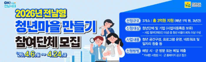 [¹Ìµð¾îÀü³² Á¦°¥´ëÁ¾ ±âÀÚ]Àü¶ó³²µµ°¡ û³â Ȱµ¿°ø°£ Á¶¼º°ú ÇâÅä ÀÚ¿øÀ» Ȱ¿ëÇÑ ÇÁ·Î±×·¥ ¿î¿µ µîÀ» ÅëÇØ Áö¿ª Ȱ·ÂÀ» ³ôÀ̱â À§ÇÑ ¡®Àü³²Çü û³â¸¶À»¡¯ 3°³¼Ò¸¦ °ø¸ðÇÑ´Ù. °ø¸ð Âü¿©¸¦ ¹Ù¶ó´Â û³â´Üü¡¤±â¾÷Àº ¿À´Â 24ÀϱîÁö ÇØ´ç ½Ã¡¦