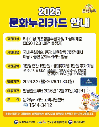 [¹Ìµð¾îÀü³² Á¦°¥´ëÁ¾ ±âÀÚ]±¤ÁÖ¹®ÈÀç´Ü(´ëÇ¥ÀÌ»ç Á÷¹«´ëÇà ÀüÀº¿Á)Àº 2¿ù 2ÀϺÎÅÍ 6¼¼ ÀÌ»ó ±âÃÊ»ýȰ¼ö±ÞÀÚ ¹× Â÷»óÀ§°èÃþÀ» ´ë»óÀ¸·Î 2026³â ¹®È´©¸®Ä«µå ¹ß±Þ°ú »ç¿ëÀÌ °¡´ÉÇÏ´Ù°í ¹àÇû´Ù. 2026³â ¹®È´©¸®Ä«µå Áö¿ø±ÝÀº Áö³ÇØ ¡¦