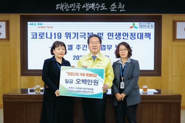 [¹Ìµð¾îÀü³² Á¦°¥´ëÁ¾ ±âÀÚ] ¼øÃµ½Ã »çȸº¹Áö°ø¹«¿ø ¸ðÀÓÀÎ ¡®»çȸº¹ÁöÇàÁ¤¿¬±¸È¸¡¯´Â Áö³ 9ÀÏ ½Ãû ¼ÒȸÀǽǿ¡¼ Äڷγª19 Ưº°¼º±Ý 5¹é¸¸¿øÀ» Àü´ÞÇß´Ù. ¼º±ÝÀÇ Àü´ÞÀº °£ºÎȸÀÇ ¼®»ó¿¡¼ Çã¼® ¼øÃµ½ÃÀå¿¡°Ô Àü´ÞÇß´Ù. »çȸº¹Áö°øµ¿¡¦