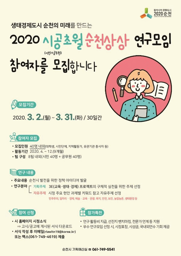 [¹Ìµð¾îÀü³² Á¦°¥´ëÁ¾ ±âÀÚ] ¼øÃµ½Ã´Â ¡®2020 ½Ã°øÃÊ¿ù ¼øÃµ»ó»ó ¿¬±¸¸ðÀÓ¡¯À» ÇÔ²²ÇÒ ½Ã¹Î 40¸íÀ» ¿À´Â 31ÀϱîÁö °ø°³ ¸ðÁýÇÑ´Ù°í ¹àÇû´Ù. ¡®½Ã°øÃÊ¿ù ¼øÃµ»ó»ó ¿¬±¸¸ðÀÓ¡¯Àº ½Ã¹Îµé°ú ½Ã °ø¹«¿øµéÀÌ ÇÔ²² ¸ð¿© Áö¿ªÇö¾ÈÀ» ÇÔ²² °í¹ÎÇÏ¡¦