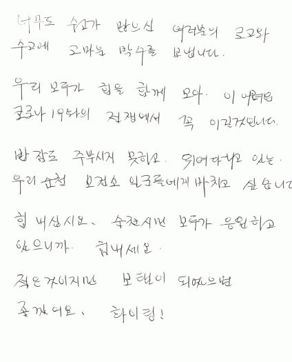 [¹Ìµð¾îÀü³² Á¦°¥´ëÁ¾ ±âÀÚ]Áö³ 5ÀÏ ¼øÃµ½Ãû ¾ÈÀüÃѰý°ú·Î À̸§À» ¹àÈ÷Áö ¾ÊÀº ½Ã¹ÎÀÌ °Ý·ÁÀÇ ¼ÕÆíÁö¿Í Çö±Ý 100¸¸¿øÀ» Àü´ÞÇÏ°í »ç¶óÁ³´Ù. ¼ÕÆíÁöÀÇ ÁÖÀÎÀº Äڷγª19 È®»ê¹æÁö¸¦ À§ÇØ °í»ýÇϰí ÀÖ´Â ¼øÃµ½Ã º¸°Ç¼Ò¸¦ À§ÇØ ÀÛÀº ÈûÀ»¡¦