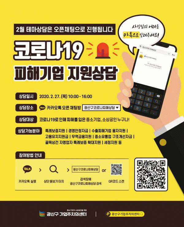 [¹Ìµð¾îÀü³² ±èÁ¤¿ì ±âÀÚ] ¿À´Â 27ÀÏ ±¤»ê±¸¿Í ±¤»ê±¸±â¾÷ÁÖÄ¡ÀǼ¾ÅͰ¡ Äڷγª19·Î ¾î·Á¿òÀ» °Þ°í ÀÖ´Â Áß¼Ò±â¾÷°ú ¼Ò»ó°øÀÎÀ» À§ÇØ Å׸¶ »ó´ãÀ» ½Ç½ÃÇÑ´Ù. ±¤»ê±¸ÀÇ Å׸¶ »ó´ãÀº, ¸Å¿ù ¼öÃ⡤Àڱݡ¤ÆÇ·Î¡¤¼¼¹«¡¤³ë¹« µî ±â¾÷°ú ¼Ò»ó°ø¡¦