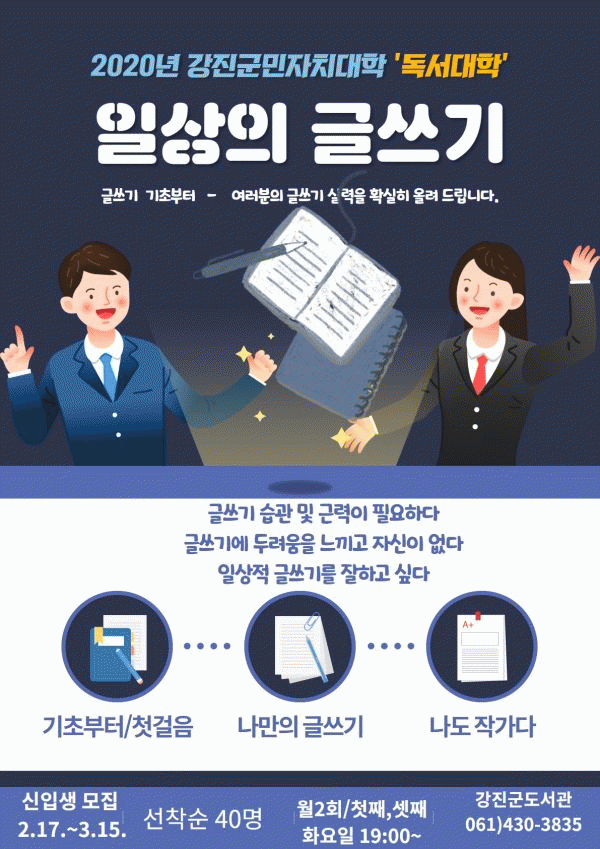 [¹Ìµð¾îÀü³² Á¦°¥´ëÁ¾ ±âÀÚ] °Áø±ºµµ¼°üÀÌ Áö¿ªÁֹεéÀÇ ±Û¾²±â ¿ª·®°È¸¦ À§ÇÑ ¡®2020³âµµ µ¶¼´ëÇÐ ¼ö°»ý¡¯À» ¸ðÁýÇÑ´Ù. °Áø±º¹ÎÀÚÄ¡´ëÇÐ µ¶¼´ëÇÐÀº Áö¿ª»çȸÀÇ ¹Ù¶÷Á÷ÇÑ µ¶¼ ¹®È¸¦ »ýȰÈÇÏ°í ´Ù¾çÇÑ µ¶¼¸¦ ÅëÇØ ½É¸®Àû ¾È¡¦
