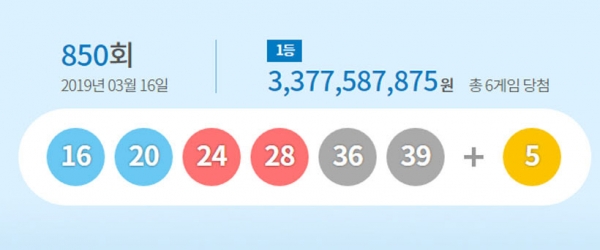 16ÀÏ MBC »ý¹æ¼Û Çູµå¸² ·Î¶Ç 645 Ãß÷¹æ¼Û¿¡ µû¸£¸é Á¦850ȸ ·Î¶Ç 1µî ´ç÷¹øÈ£´Â '28,24,20,36,39,16'À̰í, 2µî º¸³Ê½º¹øÈ£´Â '5' ÀÌ´Ù. ´ç÷¹øÈ£ 6°³¸¦ ¸ðµÎ ¸ÂÈù 1µî ´ç÷ÀÚ´Â 6¸íÀ¸·Î 33¾ï7õ758¸¸7õ875¿ø¾¿ ¹Þ´Â´Ù. ´ç÷¡¦