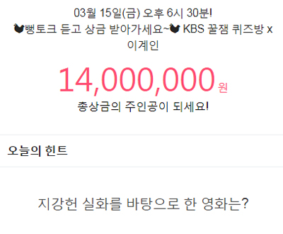 15ÀÏ ±Ý¿äÀÏ ¿ÀÈÄ 8½Ã 30ºÐ¿¡ ¹æ¼ÛµÇ´Â ´ë±¹¹Î ÄûÁî¼î Àë¶óÀÌºê ¿À´ÃÀÇ ÈùÆ®´Â 'Áö°Çå ½Çȸ¦ ¹ÙÅÁÀ¸·Î ÇÑ ¿µÈ´Â?'ÀÌ´Ù. À̳¯ ÈùÆ®¿¡ ´ëÇÑ ´äÀº Áö³ 2006³â °³ºÀÇÑ ¿µÈ 'Ȧ¸®µ¥ÀÌ'´Ù. ¿µÈ 'Ȧ¸®µ¥ÀÌ'´Â 1988³â ¼¼»óÀ» ±ô¦ ³î¡¦