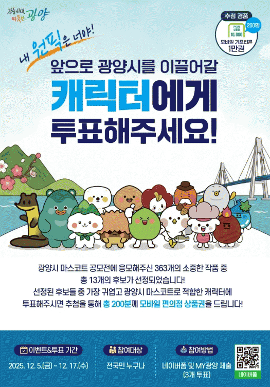 [¹Ìµð¾îÀü³² ÀÓ¼º¿Ï ±âÀÚ]±¤¾ç½Ã´Â ¾ÕÀ¸·Î ½ÃÀÇ Á¤Ã¼¼º°ú À̹ÌÁö¸¦ ´ëÇ¥ÇÒ »õ·Î¿î ij¸¯ÅÍ ¼±Á¤À» À§ÇØ 12¿ù 5ÀϺÎÅÍ 17ÀϱîÁö ¼±È£µµ ÅõÇ¥¸¦ ÁøÇàÇÑ´Ù°í 5ÀÏ ¹àÇû´Ù. À̹ø ÅõÇ¥´Â Àü¹®°¡ ½É»ç¸¦ ÅëÇØ 1Â÷·Î ¼±Á¤µÈ 13°³ ÀÛǰÀ» ´ë»óÀ¸·Î¡¦