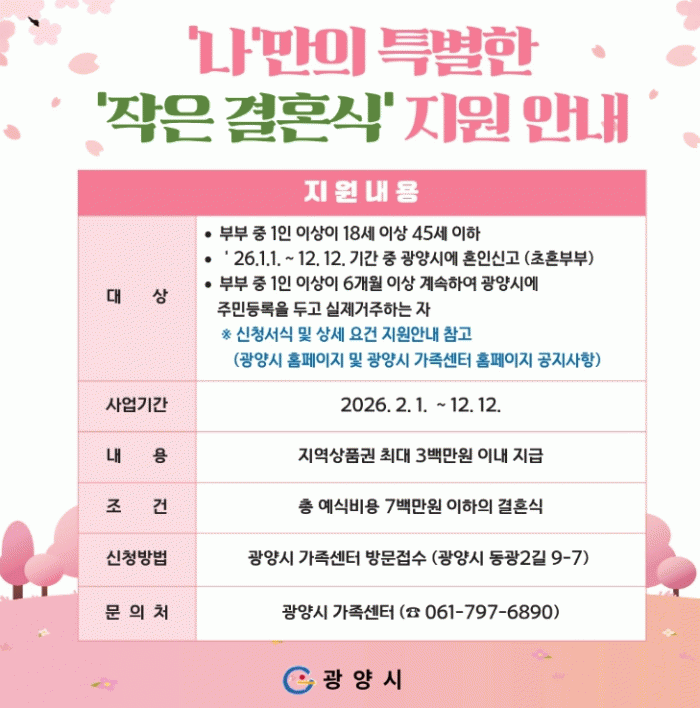 [¹Ìµð¾îÀü³² ÀÓ¼º¿Ï ±âÀÚ]±¤¾ç½Ã´Â °úµµÇÑ °áÈ¥ ºñ¿ë ºÎ´ãÀ» ¿ÏÈÇÏ°í °ÇÀüÇÑ °áÈ¥¹®È È®»êÀ» À§ÇØ, ÃÑ ¿¹½Ä ºñ¿ë 7¹é¸¸ ¿ø ÀÌÇÏÀÇ ¡®ÀÛÀº°áÈ¥½Ä¡¯À» Ä¡¸¥ ½ÅÈ¥ºÎºÎ 7½Ö¿¡°Ô Áö¿ª»óǰ±ÇÀ¸·Î ÃÖ´ë 3¹é¸¸ ¿øÀ» Áö¿øÇÒ °èȹÀÌ´Ù. Áö¿ø ´ë»ó¡¦