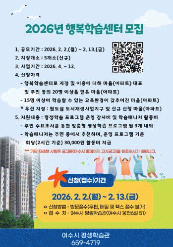 [¹Ìµð¾îÀü³² ÀüÇü¼º ±âÀÚ]¿©¼ö½Ã´Â ÁֹΠ»ýȰ±Ç Áß½ÉÀÇ Æò»ýÇнÀ ±âȸ¸¦ È®´ëÇϱâ À§ÇØ '2026³â À¾¡¤¸é¡¤µ¿ ÇູÇнÀ¼¾ÅÍ' ½Å±Ô ÁöÁ¤ »ç¾÷¿¡ Âü¿©ÇÒ ¸¶À»(¾ÆÆÄÆ®)À» ¸ðÁýÇÑ´Ù°í ¹àÇû´Ù. ÇູÇнÀ¼¾ÅÍ´Â À¾¡¤¸é¡¤µ¿ ´ÜÀ§¿¡¼ ÁÖ¹ÎÀÇ ÇнÀ¡¦