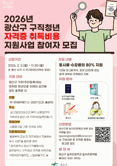 [¹Ìµð¾îÀü³² Á¦°¥´ëÁ¾ ±âÀÚ]±¤ÁÖ ±¤»ê±¸°¡ Ãë¾÷À» ÁغñÇϴ û³âÀÇ ÀÚ°ÝÁõ Ãëµæºñ¿ë Áö¿øÀ» ¿ÃÇØ ÃÖ´ë 20¸¸ ¿øÀ¸·Î È®´ëÇÑ´Ù. ±¤»ê±¸´Â 2¿ùºÎÅÍ °í¹°°¡¿Í Ãë¾÷³À̶õ ÀÌÁß°í »óȲ¿¡¼ û³âÀÇ Ãë¾÷ ¿ª·® °È¿Í ±¸Á÷ Ȱµ¿¿¡ µå´Â °æÁ¦Àû ¡¦