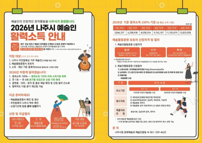 [¹Ìµð¾îÀü³² Á¦°¥´ëÁ¾ ±âÀÚ]Àü¶ó³²µµ ³ªÁֽð¡ Áö¿ª ¿¹¼úÀÎÀÇ ¾ÈÁ¤ÀûÀΠâÀÛ È°µ¿°ú »ýȰ ¾ÈÁ¤À» µ¿½Ã¿¡ Áö¿øÇϱâ À§ÇØ ¡®2026 ¿¹¼úÀΠȰ·Â¼Òµæ Áö¿ø±Ý¡¯ ½Åû Á¢¼ö¸¦ ½ÃÀÛÇÏ¸ç ¹®È¿¹¼ú »ýŰèÀÇ Áö¼Ó °¡´É¼ºÀ» °ÈÇÑ´Ù. ³ªÁֽô ¿¹¼ú¡¦