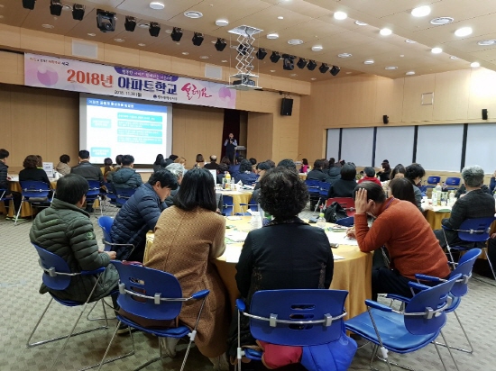 [±¤ÁÖ=¹Ìµð¾îÀü³²]À±¹ÌÇý ±âÀÚ=±¤ÁÖ±¤¿ª½Ã ¼±¸Ã»ÀÌ ÁÖÃÖÇÏ°í ¼±¸¸¶À»°øµ¿Ã¼Á¾ÇÕÁö¿ø¼¾ÅÍ¿¡¼ ÁÖ°üÇÏ´Â ÇູÇÑ ¾ÆÆÄÆ® ÇÔ²²ÇÏ´Â ÀÌ¿ô»çÃÌÀ» À§ÇÑ '2018³â ¾ÆÆÄÆ®Çб³ ¼³·¹ÀÓ'ÀÌ 26ÀÏ ¼±¸Ã» ´ëȸÀǽǿ¡¼ ¿·È´Ù. ¾ÆÆÄÆ®°øµ¿Ã¼¡¦
