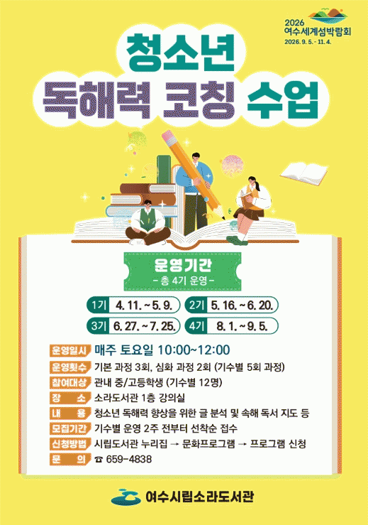 [¹Ìµð¾îÀü³² ÀüÇü¼º ±âÀÚ] ¿©¼ö½Ã´Â ¿À´Â 4¿ù 11ÀϺÎÅÍ °ü³» Áß¡¤°íµîÇлýÀ» ´ë»óÀ¸·Î ¡®Ã»¼Ò³â µ¶ÇØ·Â ÄÚĪ ¼ö¾÷¡¯ ÇÁ·Î±×·¥À» ¿î¿µÇÑ´Ù°í ¹àÇû´Ù. ¡®Ã»¼Ò³â µ¶ÇØ·Â ÄÚĪ ¼ö¾÷¡¯Àº û¼Ò³âÀÇ µ¶ÇØ·Â Çâ»óÀ» À§ÇØ ¼Óµ¶ ÈÆ·Ã°ú Çٽɾî ã±â¡¦