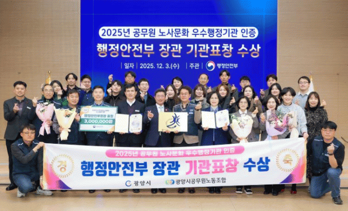 [¹Ìµð¾îÀü³² ÀÓ¼º¿Ï ±âÀÚ]±¤¾ç½Ã°¡ ÇàÁ¤¾ÈÀüºÎ°¡ ÁÖ°üÇÑ ¡®2025³â °ø¹«¿ø ³ë»ç¹®È ¿ì¼öÇàÁ¤±â°ü ÀÎÁõÁ¦¡¯ ½É»ç¿¡¼ ¿ì¼öÇàÁ¤±â°üÀ¸·Î ¼±Á¤µÅ ÇàÁ¤¾ÈÀüºÎÀå°ü ǥâÀ» ¼ö»óÇß´Ù. ¡®°ø¹«¿ø ³ë»ç¹®È ¿ì¼öÇàÁ¤±â°ü ÀÎÁõÁ¦¡¯´Â ¸ð¹üÀûÀÎ ³ë»ç¡¦