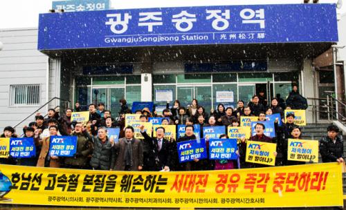 [±¤ÁÖ=¹Ìµð¾îÀü³²] ¹ÚÂù ±âÀÚ = 29ÀÏ ¿ÀÈÄ ±¤»ê±¸ ¼ÛÁ¤¿ª ¾Õ¿¡¼ ±¤ÁÖ ÀÇ»çȸ, Ä¡°ú ÀÇ»çȸ, ÇÑÀÇ»çȸ, ¾à»çȸ, °£È£»çȸ´Â ±âÀÚȸ°ßÀ» ¿°í KTX ¼´ëÀü °æÀ¯¸¦ ¹Ý´ëÇϸç '°í¼Óöµµ´Â °í¼Óöµµ´ä°Ô ¿î¿µÇÏ´Â °ÍÀÌ »ó½ÄÀÌÀÚ ¿øÄ¢'À̶ó°í ÁÖ¡¦