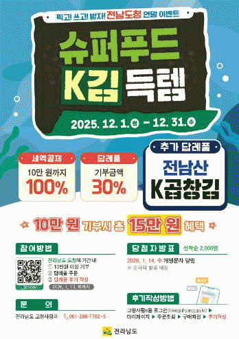 [¹Ìµð¾îÀü³² Á¦°¥´ëÁ¾ ±âÀÚ]Àü¶ó³²µµ°¡ ¿¬¸»À» ¸Â¾Æ °íÇâ»ç¶û±âºÎÁ¦ Âü¿© È®´ë¿Í Áö¿ª ¼ö»ê¹° ¼Òºñ ÃËÁøÀ» À§ÇØ ½´ÆÛǪµå ÄÉÀÌ(K)±èÀ» Ȱ¿ëÇÑ ´ë±Ô¸ð ¿¬¸» À̺¥Æ®¸¦ ÁøÇàÇÑ´Ù. À̹ø Çà»ç´Â ±âºÎ¹®È È®»ê»Ó ¾Æ´Ï¶ó ¼¼°è°¡ »ç¶ûÇÑ Àü³² ÄÉ¡¦
